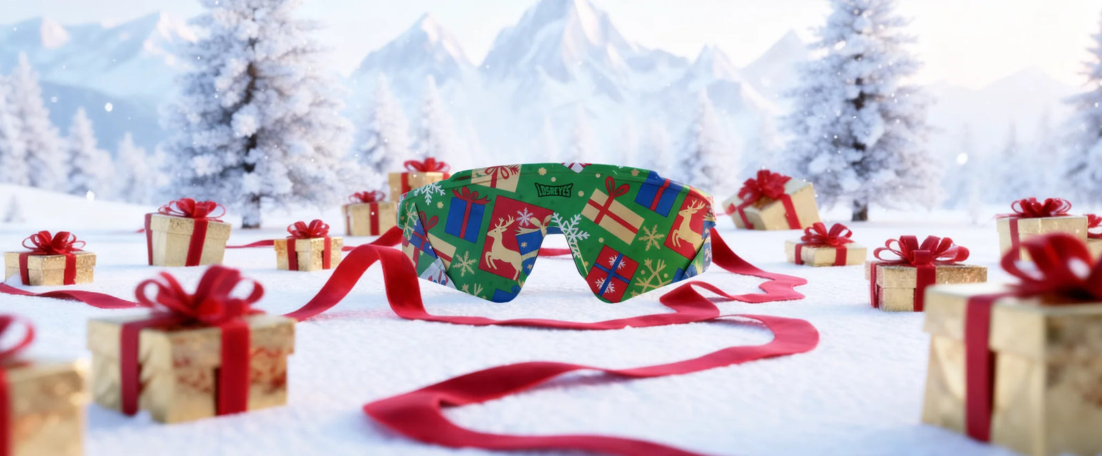 Three pairs of polarized sunglasses with mountainous landscape lenses against a snowy background LosReye, best gifts under 59$Snow globe with LosReyes polarized sunglasses reflecting mountains on a snowy background