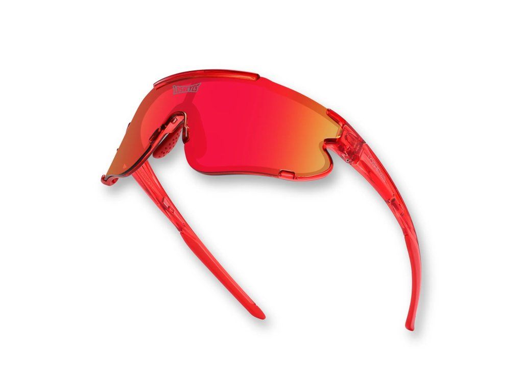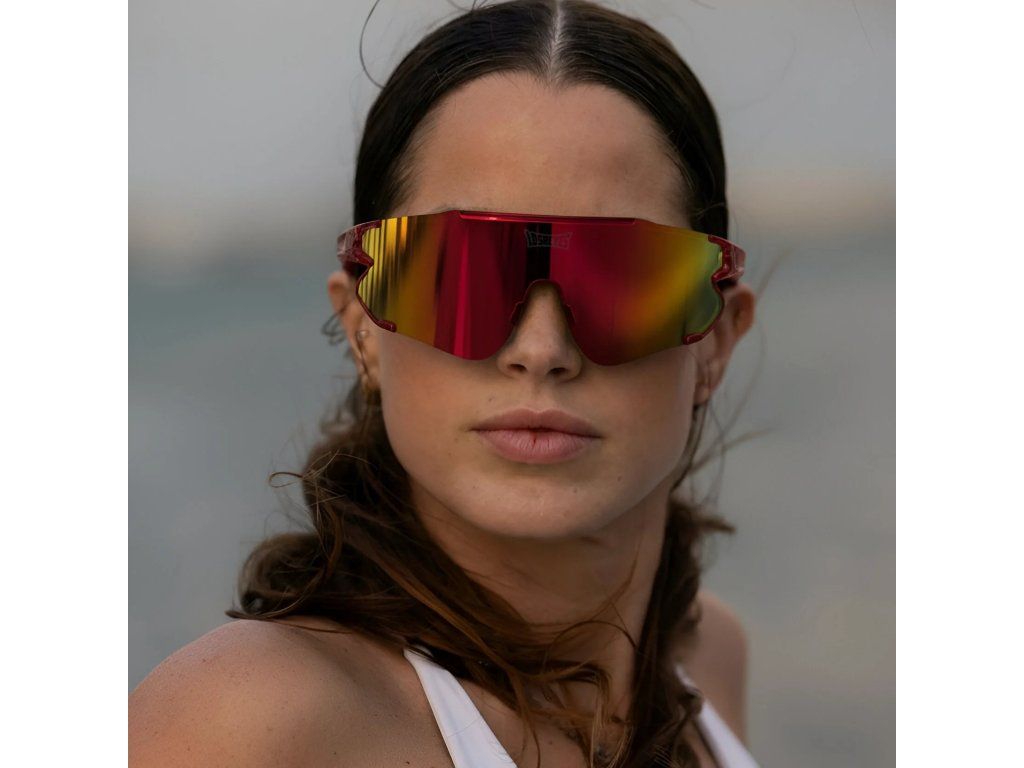 Červený rám, červenozlaté zrcadlové čočky – výkonnostní brýle pro sportovce, kteří hrají odvážně a zakončují silněji.