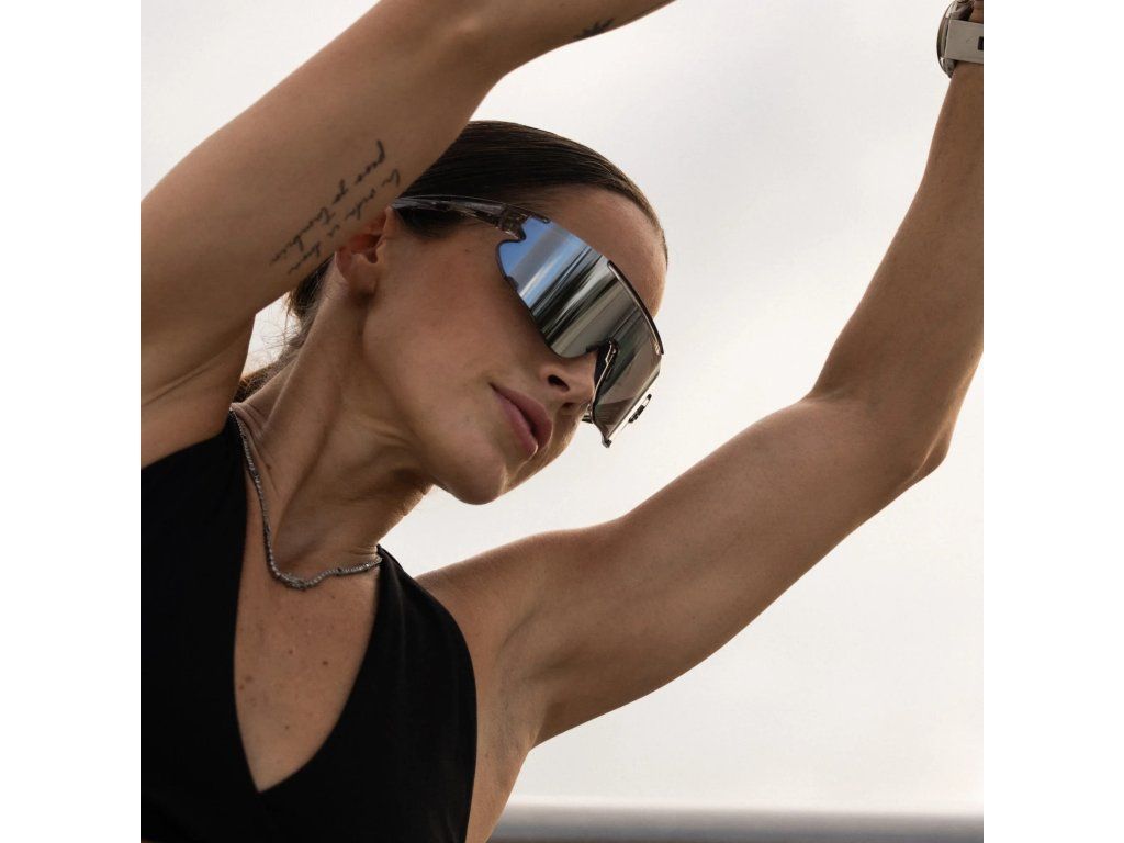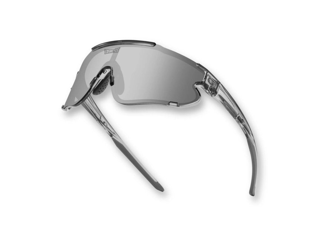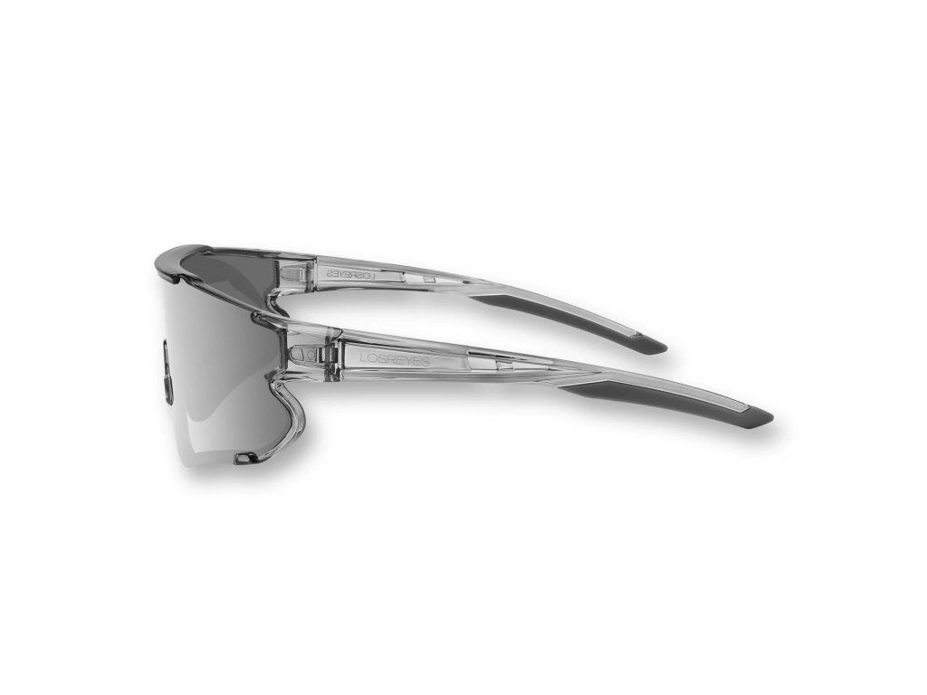 Průhledný šedý rám, stříbrné zrcadlové čočky – výkonné sluneční brýle určené pro sportovce, kteří nechají soustředění mluvit za sebe.