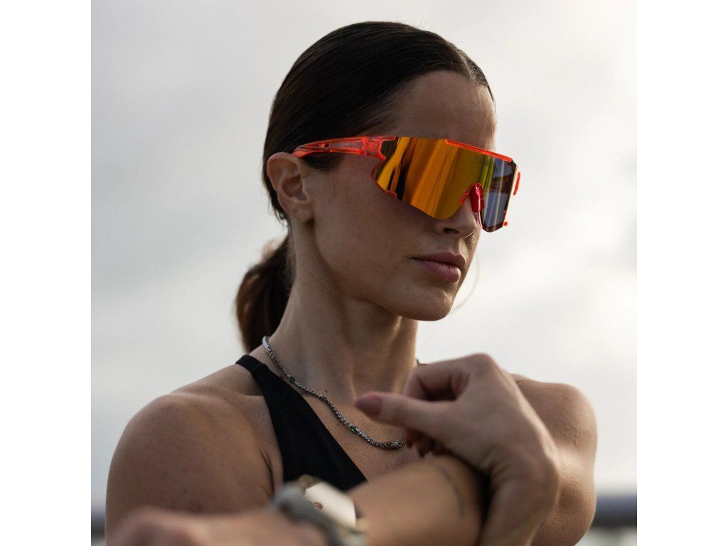 Broskvové obroučky, oranžové zrcadlové čočky – sportovní brýle určené pro sportovce, kteří přinášejí sebevědomí do každé arény.