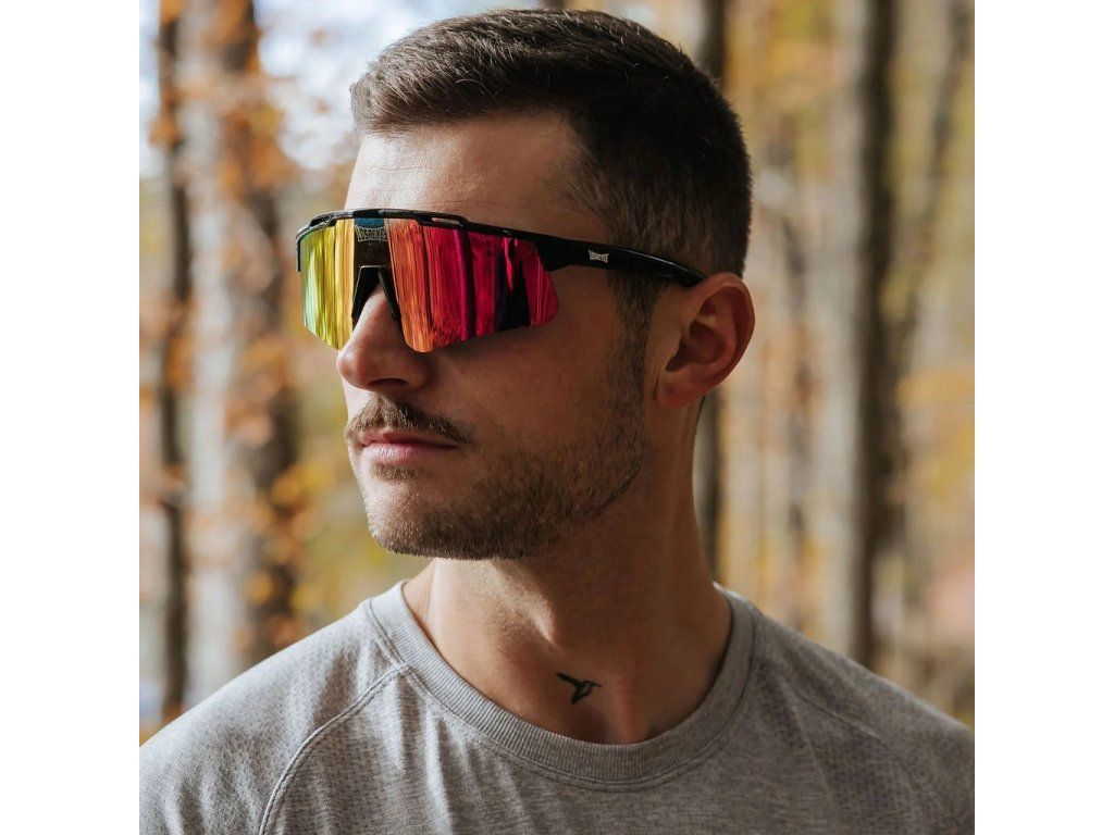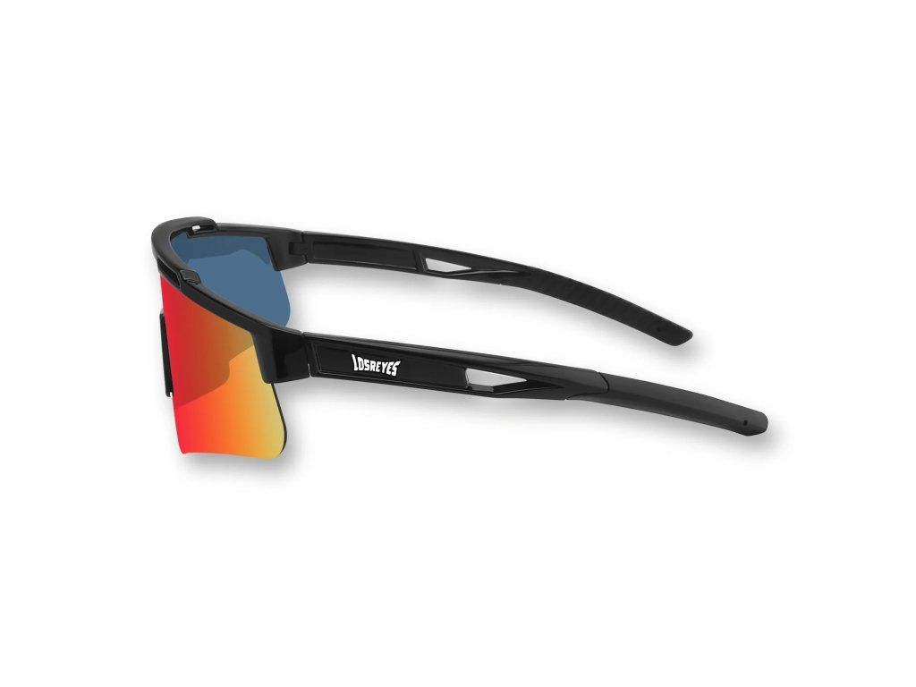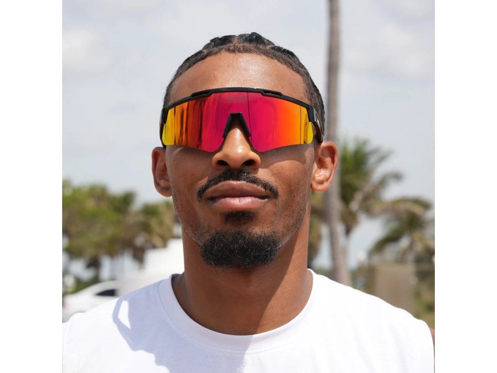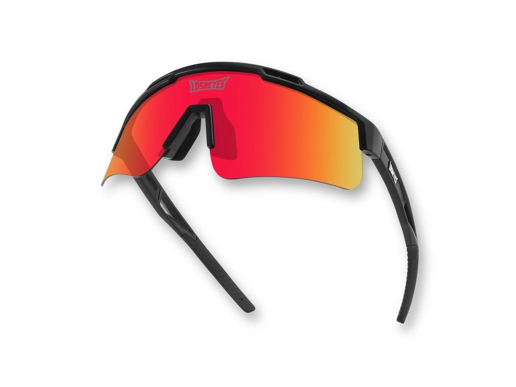 Vyjádření pohybu a mistrovství – černý rám, červené zrcadlové čočky a precizní optika navržená pro ty, kteří nikdy nezpomalují.