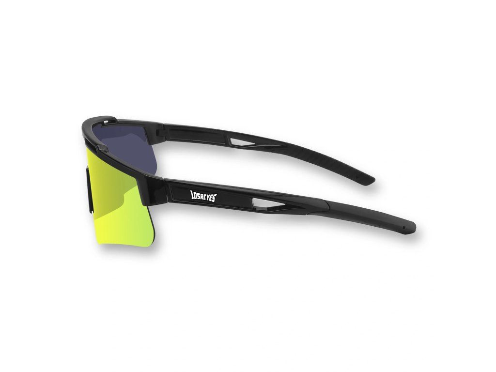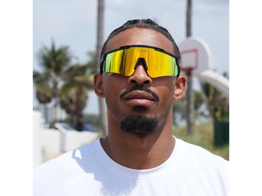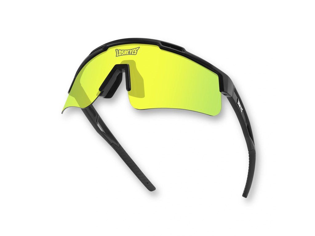 Studie v oblasti kontroly oslnění a přesnosti – černá obroučka, žluté zrcadlové čočky a polarizované brýle určené pro rybáře, kteří žijí světlem, vodou a pohybem.